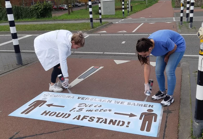 Vorige week vrijdag vroeg de gemeente Pijnacker-Nootdorp of wij met spoed een 1,50 m Houd afstand-sjabloon konden maken. Op maandag hebben we ze gemaakt. Want wij zijn gewoon aan het werk. En dinsdagmiddag stonden de eerste teksten op de weg. Ook in deze crisis denken wij mee en kunnen we snel handelen.