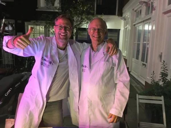 We stonden buiten voor de deur van het pand, het was tenslotte mooi weer. Het was een drukte van belang. En alle gasten waren zeer enthousiast.