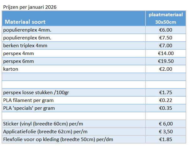 Hieronder vindt u onze prijzen (incl.btw):